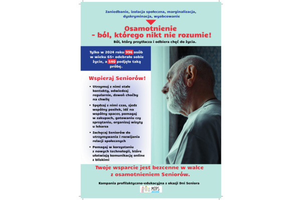 Każdego roku w miesiącach październik – listopad obchodzone są Dni Seniora.Na arenie międzynarodowej, 1 października obchodzony jest Międzynarodowy Dzień Osób Starszych, 20 października Europejski Dzień Seniora, a 14 listopada Światowy Dzień Seniora i Ogólnopolski Dzień Seniora.W tegorocznej kampanii profilaktyczno-edukacyjnej pt. "Osamotnienie – ból, którego nikt nie rozumie" pragniemy zwrócić uwagę na dramatyczny stan zdrowia psychicznego wśród osób starszych, w kontekście dużej liczby prób samobójczych i samobójstw wśród tej grupy wiekowej. Seniorzy, którzy pozostawiają listy pożegnalne piszą w nich, że czują się osamotnieni, nie potrafią odnaleźć poczucia sensu życia, czują, że są ciężarem dla bliskich. Jednym z głównych powodów osamotnienia seniorów jest postępująca izolacja społeczna i brak satysfakcjonujących relacji międzyludzkich. Do takiej sytuacji osób starszych niestety przyczyniamy się wszyscy, a przecież nierzadko wystarczy chwila rozmowy, okazanie troski i zainteresowań.
