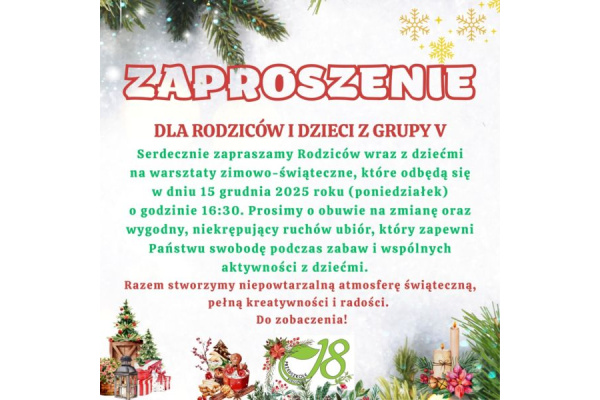 Serdecznie zapraszamy Rodziców i dzieci z grupy V - 6 latki na warsztaty zimowo - świąteczne , które odbędą się 15.12 2025r. w poniedziałek o godzinie 1630