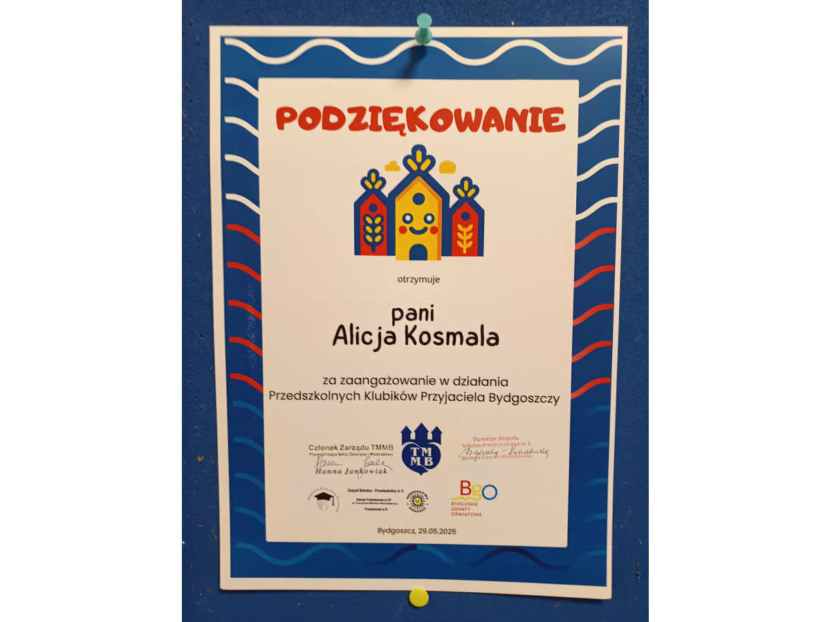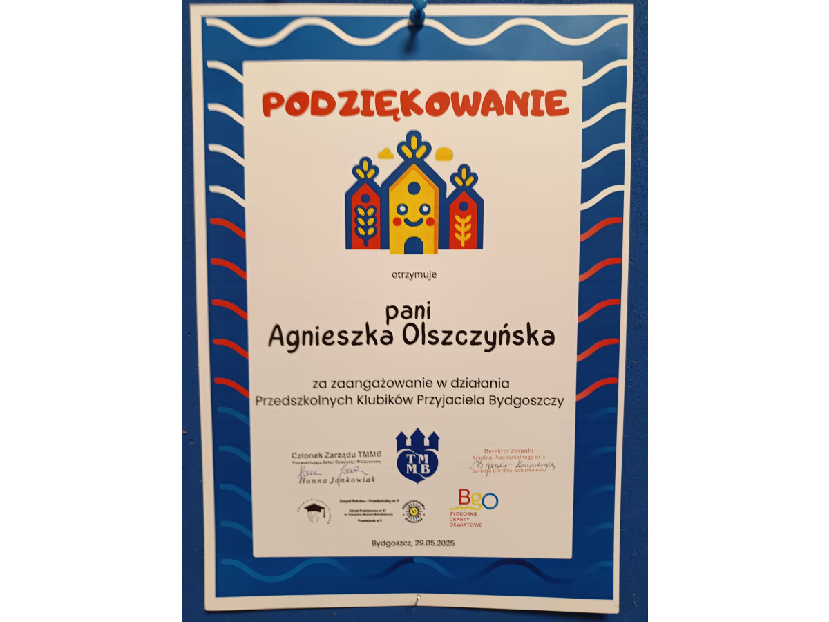DYPLOM I PODZIĘKOWANIA MAŁEGO PRZYJACIELA BYDGOSZCZY