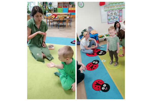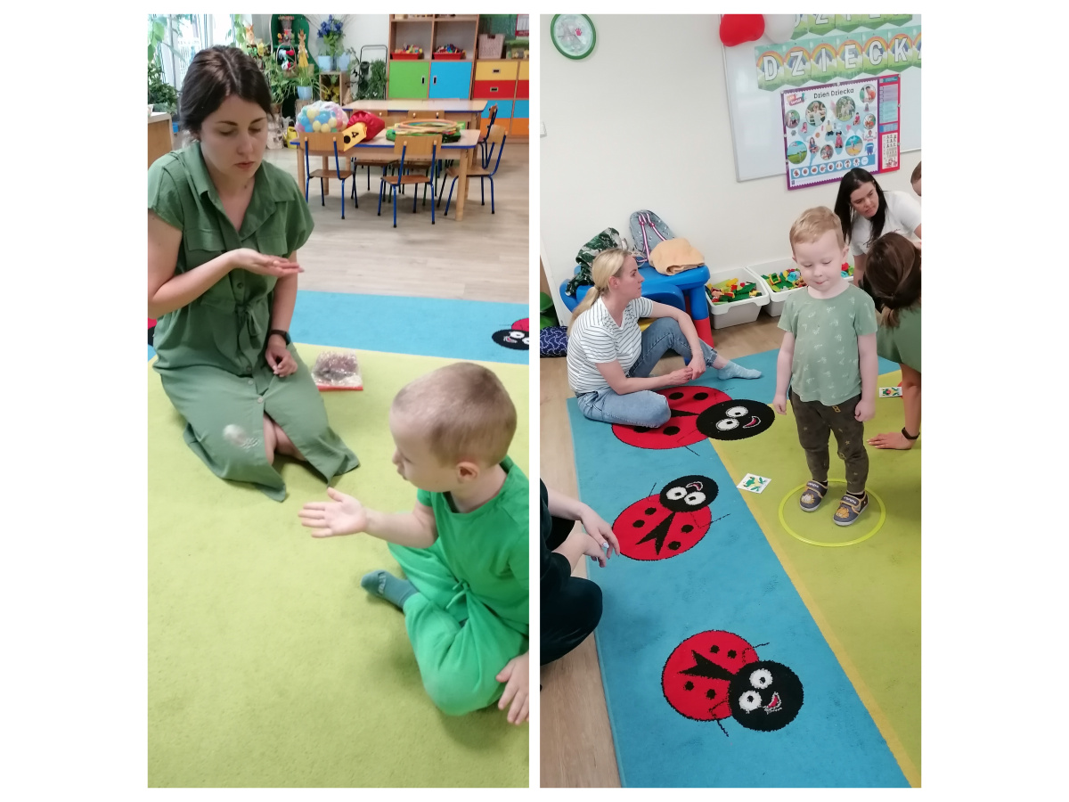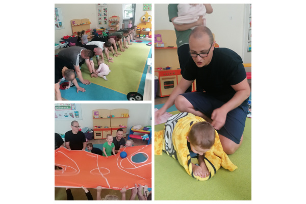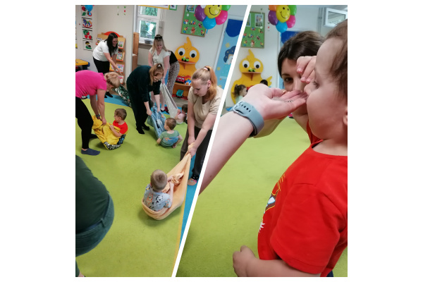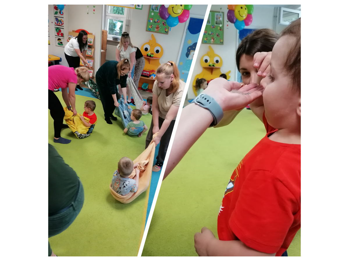 Wykorzystaliśmy elementy metody ruchu rozwijającego Weroniki Sherborne – by pokazać, że: relacja z Rodzicem to fundament rozwoju, że nie potrzeba zabawek, by świetnie się bawić a wspólne chwile mają ogromną moc ! Pani neurologopeda – Natalia z Poradni Psychologiczno-Pedagogicznej nr 1 przygotowała dla dzieci 3-letnich zestaw zabaw logopedycznych. Rodzice mogli zobaczyć jak w prosty i zabawowy sposób można ćwiczyć z dzieckiem narządy artykulacyjne niezbędne w procesie komunikacji.
