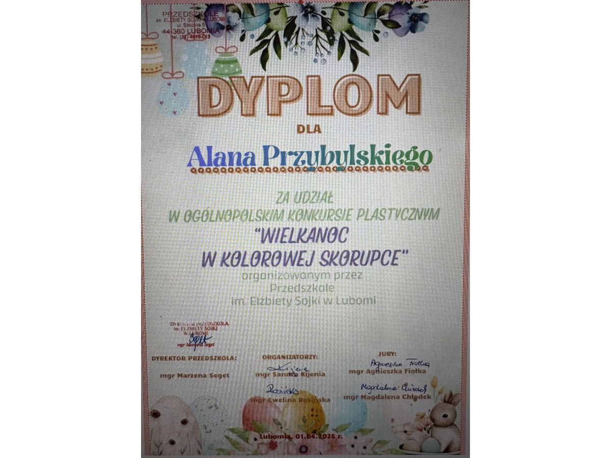 GALERIA - PODZIĘKOWANIE DLA ALANA PRZYBYLSKIEGO ZA UDZIAŁ W OGÓLNOPOLSKIM KONKURSIE PLASTYCZNYM PT." WIELKANOC W KOLOROWEJ SKORUPCE ."