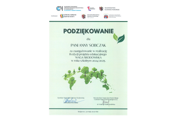 Czytaj więcej!PODZIĘKOWANIE ZA ZAANGAŻOWANIE W REALIZACJĘ II EDYCJI PROJEKTU EDUKACYJNEGO WAGA ŚRODOWISKA