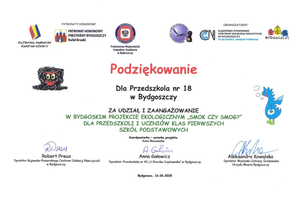 Czytaj więcej!PODZIĘKOWANIE ZA UDZIAŁ I ZAANGAŻOWANIE W BYDGOSKIM PROJEKCIE EKOLOGICZNYM "SMOK CZY SMOG?"