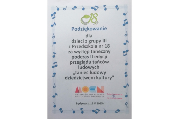 16 maja nasze Przedszkole nr 18 w Bydgoszczy miało zaszczyt być gospodarzem wyjątkowego wydarzenia – II Miejskiego Przeglądu Tańców Ludowych. W tanecznym święcie udział wzięły dzieci z Przedszkola nr 18, Przedszkola nr 24, Przedszkola nr 31 i Przedszkola nr 49. Na scenie zaprezentowano kujawiaka, krakowiaka i poloneza, a całe wydarzenie odbyło się w niezwykle radosnej i przyjemnej atmosferze.