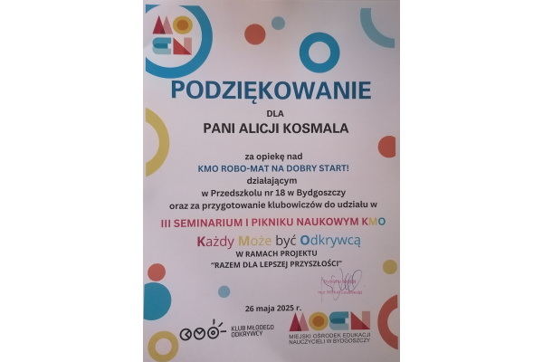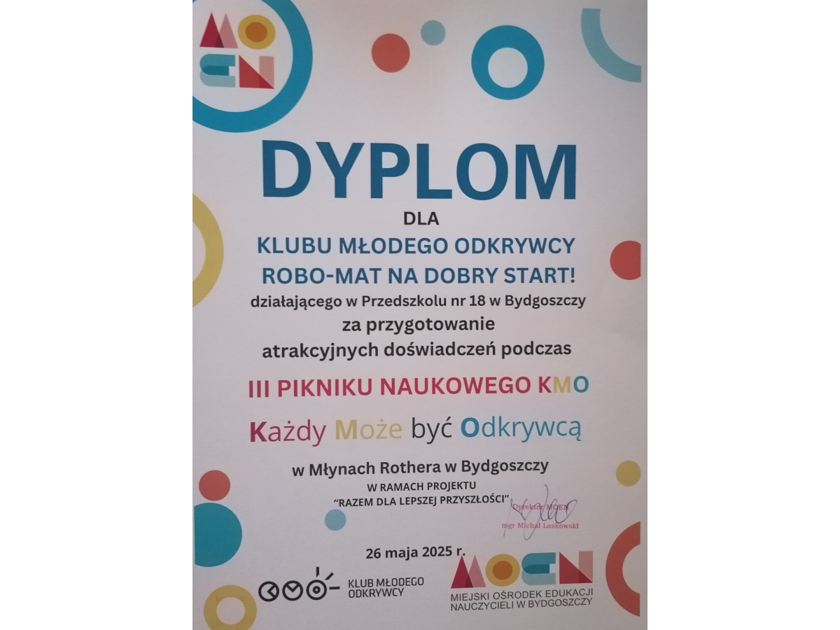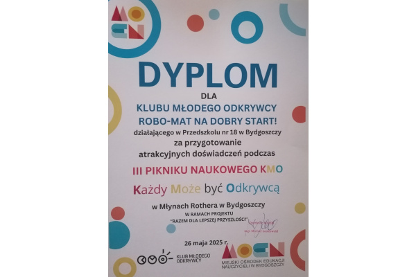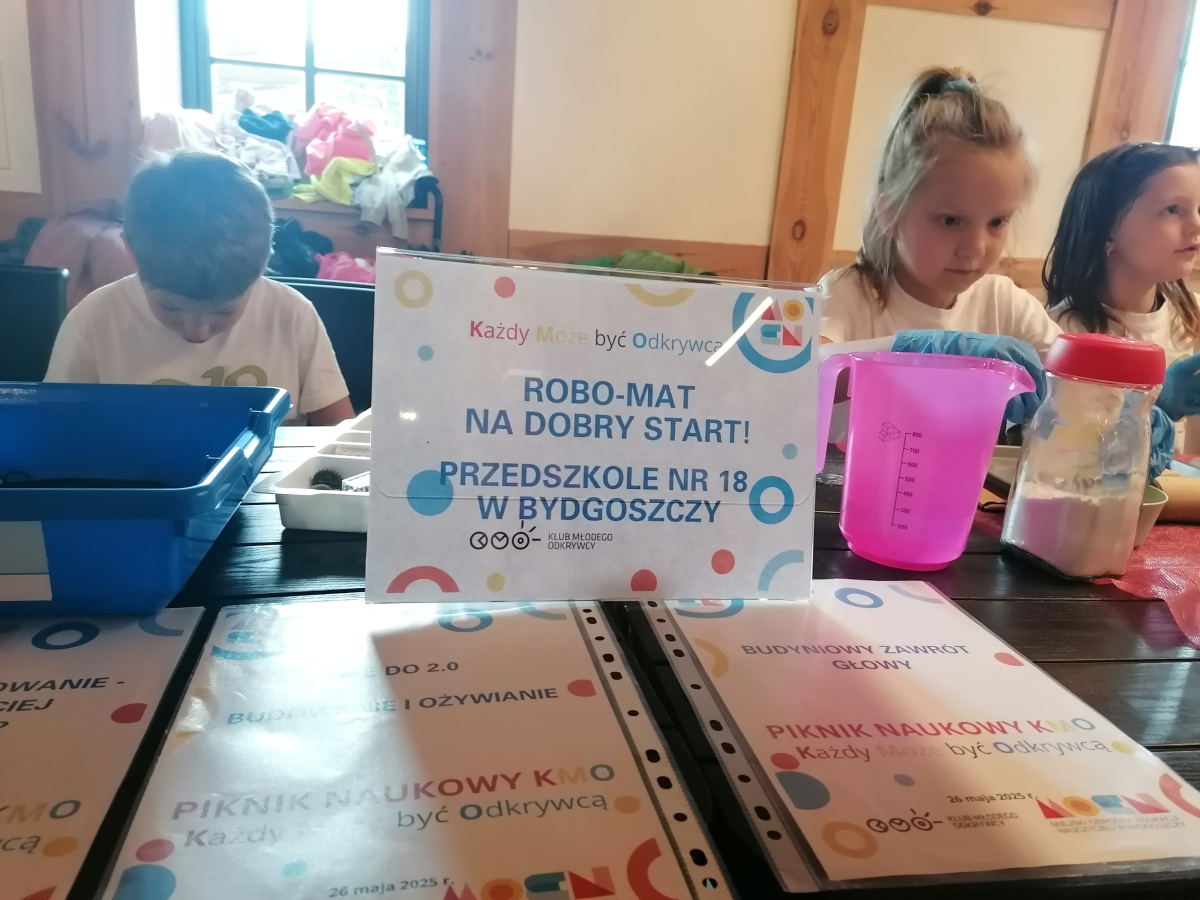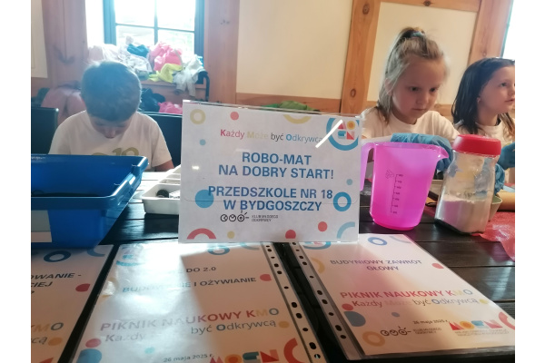 26 maja dzieci z grupy V miały przyjemność prezentować doświadczenia i eksperymenty podczas III PIKNIKU NAUKOWEGO KMO W MŁYNACH ROTHERA W SPICHRZU MĄCZNYM. Dziewczynki eksperymentowały z kolorową cieczą i masą budyniową. Chłopcy budowali, programowali i wykonywali doświadczenia związane z prędkością i wagą przedmiotów. W tym roku szkolnym zarejestrowany został w naszym przedszkolu KLUB MŁODEGO ODKRYWCY – „ROBO-MAT NA DOBRY START!” Ciekawe świata dzieci wraz z opiekunami klubu w grupie I i V wykonują doświadczenia oraz eksperymenty. Organizatorem wydarzenia był KMO, MOEN w Bydgoszczy oraz MŁYNY ROTHERA. Koordynatorem programu jest CENTRUM NAUKI KOPERNIK. Na dalszą działalność klub otrzymał nagrodę - bon podarunkowy w wysokości 650 zł. Dziękujemy paniom doradczyniom metodycznym biologii z Miejskiego Ośrodka Edukacji Nauczycieli w Bydgoszczy za zorganizowanie pikniku, piękne nagrody i możliwość doświadczania świata z perspektywy nauki w trakcie wydarzenia.