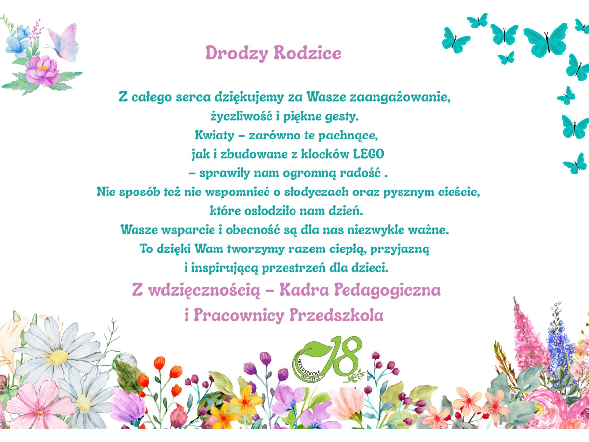 Z całego serca dziękujemy za Wasze zaangażowanie, życzliwość i piękne gesty. Kwiaty – zarówno te pachnące, jak i zbudowane z klocków LEGO – sprawiły nam ogromną radość Nie sposób też nie wspomnieć o słodyczach oraz pysznym cieście, które osłodziło nam dzień. Wasze wsparcie i obecność są dla nas niezwykle ważne. To dzięki Wam tworzymy razem ciepłą, przyjazną i inspirującą przestrzeń dla dzieci.Z wdzięcznością – Kadra Pedagogiczna i Pracownicy Przedszkola
