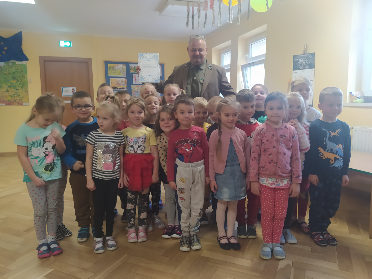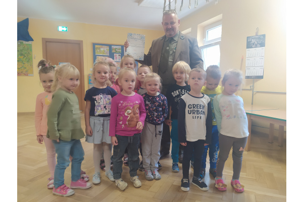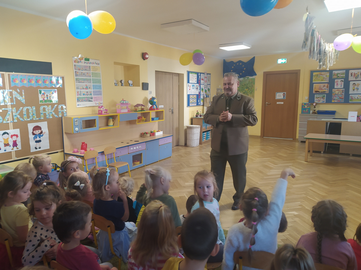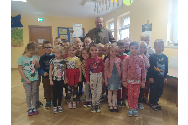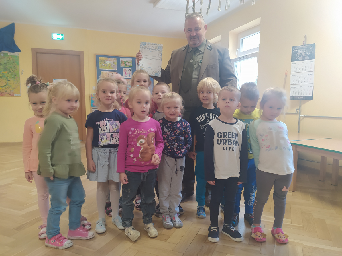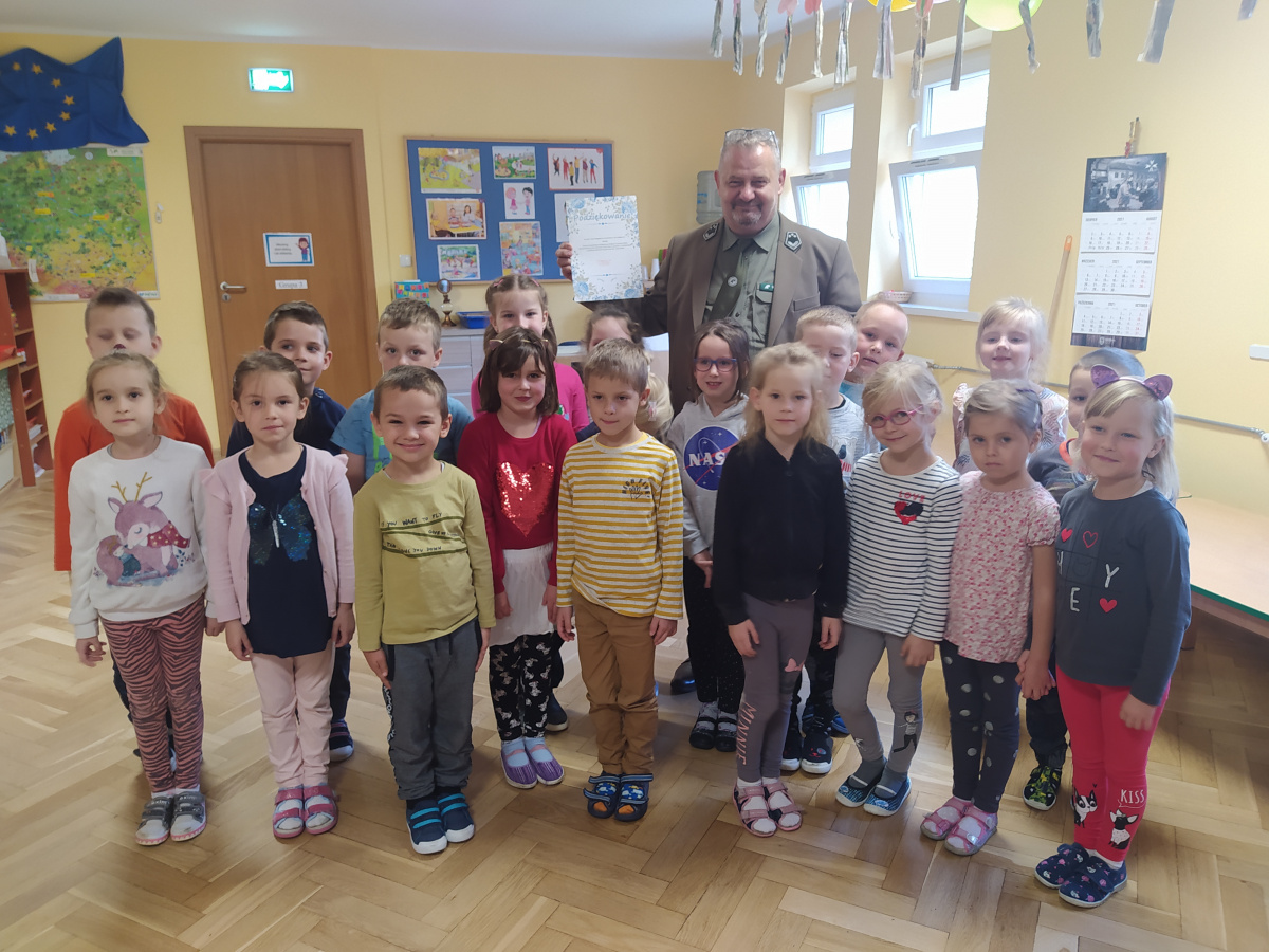 Dnia 21.09.2021r. przedszkolaków z naszego przedszkola odwiedził niezwykły gość: pan leśniczy Adam Kata z leśnictwa Żółwin. Na początku spotkania pan Adam zaprezentował dzieciom swój mundur a następnie opowiedział nam o swojej pracy, o lesie i mieszkających w nim zwierzętach. Podkreślił, że człowiek jest gościem w lesie i musi szanować zwyczaje gospodarzy, czyli zwierząt w nim mieszkających. Podczas spotkania dzieci miały okazję poznać zwyczaje wybranych zwierząt (sarny, dzika, lisa, łosia) zamieszkujących lasy naszej okolicy.