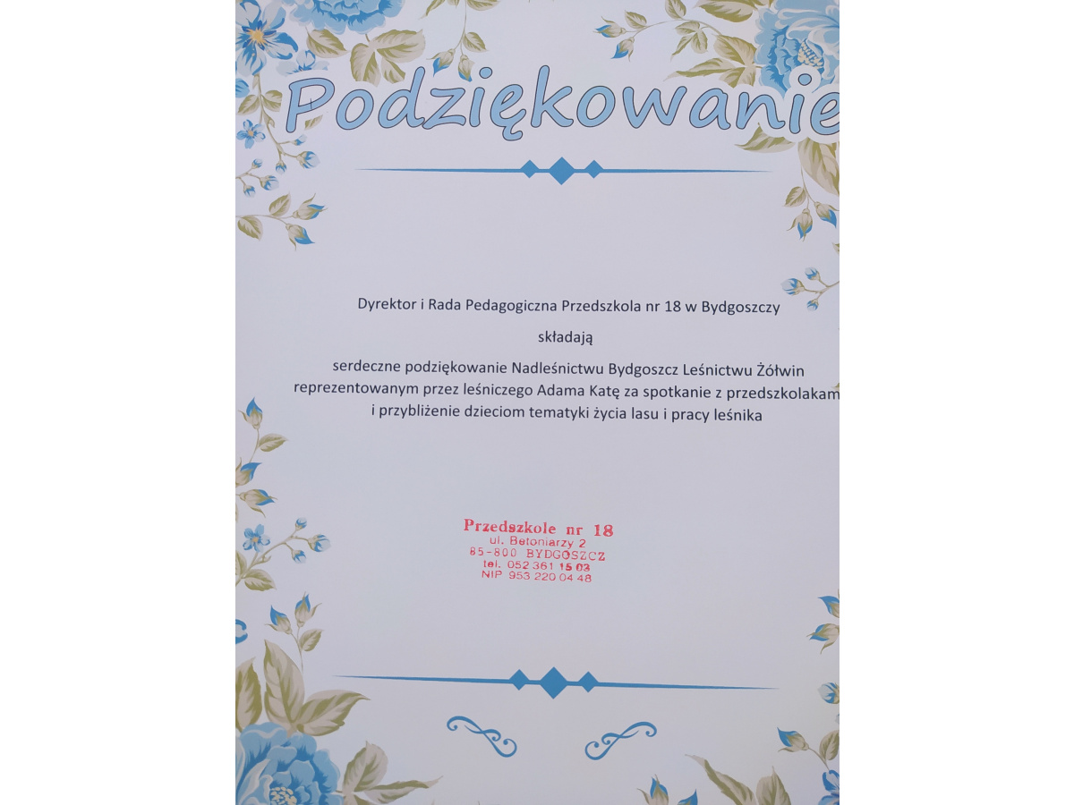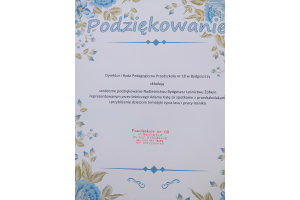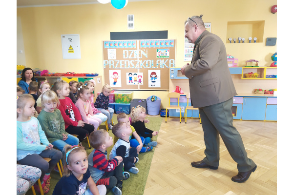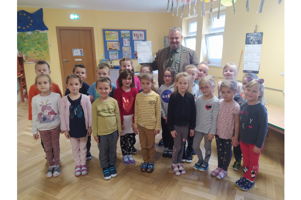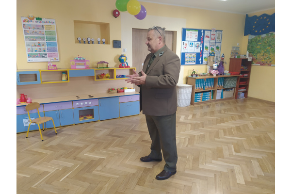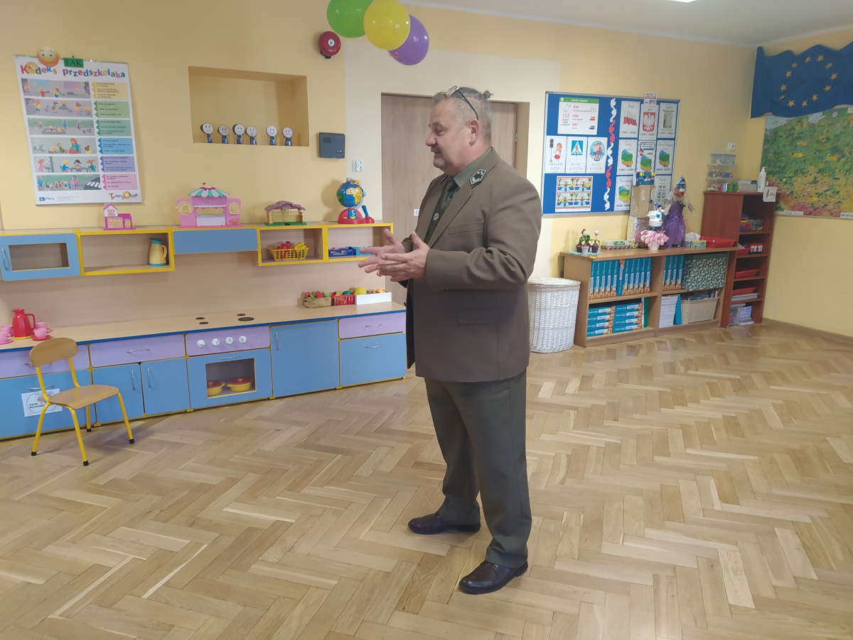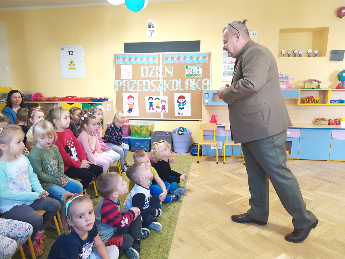 Dnia 21.09.2021r. przedszkolaków z naszego przedszkola odwiedził niezwykły gość: pan leśniczy Adam Kata z leśnictwa Żółwin. Na początku spotkania pan Adam zaprezentował dzieciom swój mundur a następnie opowiedział nam o swojej pracy, o lesie i mieszkających w nim zwierzętach. Podkreślił, że człowiek jest gościem w lesie i musi szanować zwyczaje gospodarzy, czyli zwierząt w nim mieszkających. Podczas spotkania dzieci miały okazję poznać zwyczaje wybranych zwierząt (sarny, dzika, lisa, łosia) zamieszkujących lasy naszej okolicy.